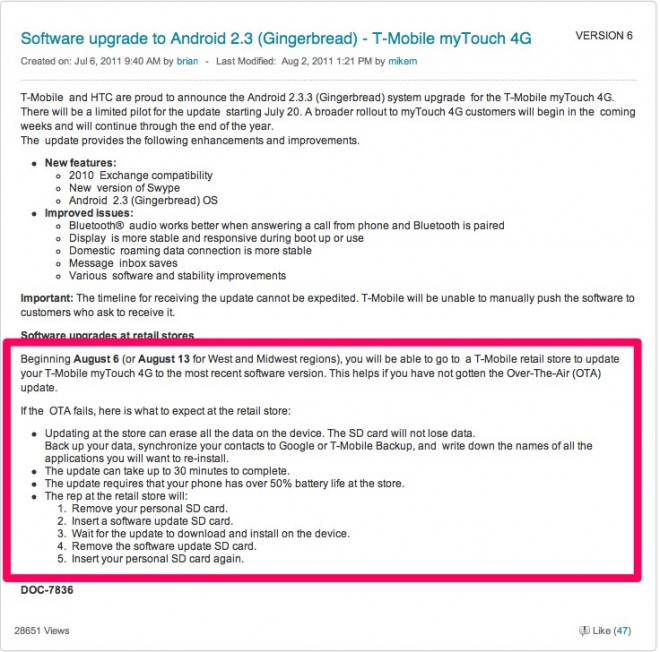 Good news for T-Mobile G2 and myTouch 4G users as T-Mobile has updated their support documents for both devices enabling customers to visit their local T-Mobile store and upgrade their device to Gingerbread.