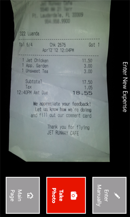 - Select “Take Photo” to record an expense by taking a photo of your bill, receipt, register, etc. or select “Enter Manually” to input your expense