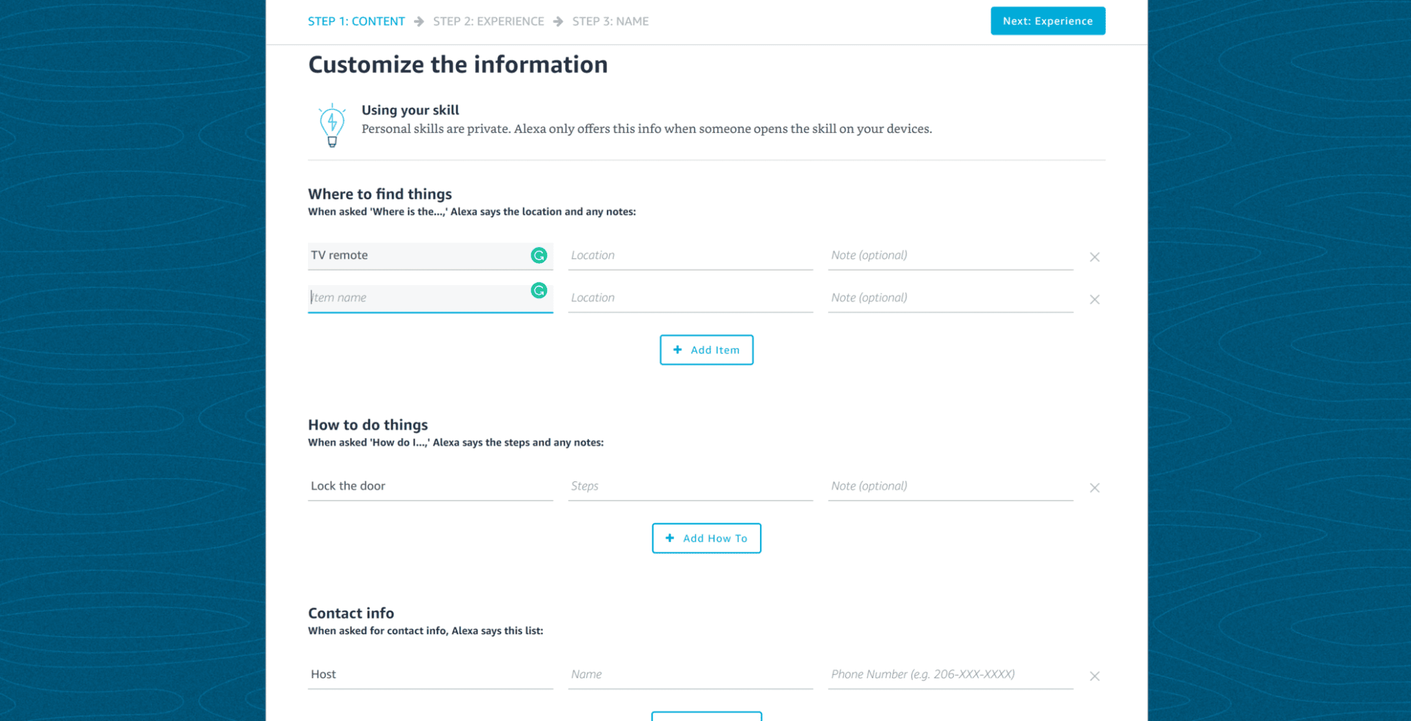 - Houseguest: Put in devices and where to find them or actions and how to do them (i.e. “Where is the toilet paper?” vs “How do I lock the door?”).