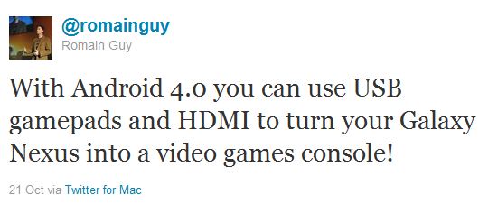 It looks like Android 4.0 just got a little sweeter. Thanks to confirmation from Google’s framework engineer Romain Guy’s Twitter account, we now know that Android 4.0 (Ice Cream Sandwich) supports USB gamepads and HDMI. Basically, with the Samsung Galaxy Nexus, gamers are able to hook up an external gamepad to a USB-to-microUSB adapter, connect it to theTV and presto- that beast of a smartphone transforms into a full on portable gaming console.