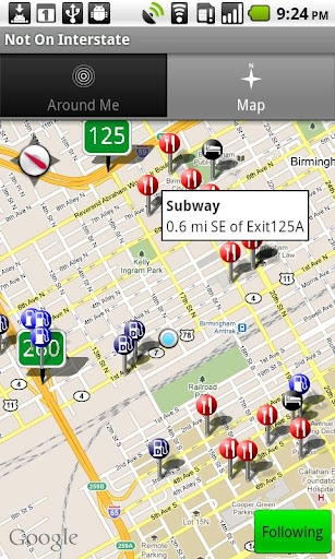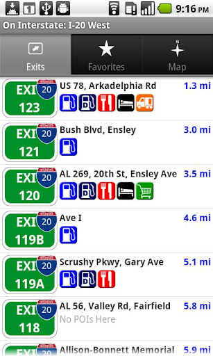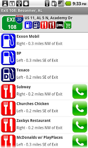 Every entry in the app includes the business’s distance in miles from your current location, its distance from the off-ramp, a map, and a contact phone number. Oddly enough, you will not see a physical address of the locations just a map with directions.