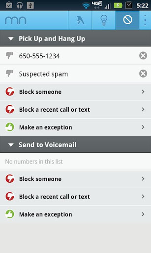 Upon opening Mr. Number, the app displays how you appear in other people’s caller ID, the option to use Mr. Number as your default messaging app, and an option to share your contacts with Mr. Number. Android and BlackBerry users pay $1.99/month for crowd-sourced caller ID and reverse lookup. However, the fee is waived for anyone who agrees to share their contact list with Mr. Number; that’s where the ID data comes from. From there the app then takes you to your home page. The home page displays who your number one contact is, calls you never returned, contacts you are neglecting, and your call and text activity for the month. You are then presented with a “blocklist”, which you can have contacts either sent to voicemail or have Mr. Number pick up the call and then hang up. What’s great about Mr. Number is the amount of options provided when choosing how you want to block. Options include: suspected spam, all private/blocked numbers, choose from recent calls or texts, manually enter a number, choose from contacts, all numbers not in your contacts, all numbers beginning with…, all numbers in your contacts, or just all numbers.  Once you’ve created your custom rules you always have the option to remove a rule at anytime, should your preferences change in the future. To view your blocklist history simply tap on the home button (Mr. Number icon) and swipe.