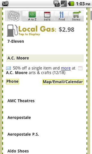 - Cheapest Gas: Displays name, location, and current pump price. Tap on “Navigate Here” to get turn by turn map directions.