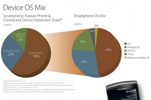 Millennial Media, a private mobile ad network, has released some graphs showing Android devices are about to top Apple’s iOS for operating system impressions. The chart above shows that shows Apple is at 46% while the Android is 29%. Android has grown from 6% of the mix OS smart phone market in March to 29% in September while Apple has dropped from 70% to 46% during the same period. Millennial found that smart phones are growing 7% each month and with smart phones currently being at 58% it will be sooner than later almost everyone has a smart phone. However, feature phones are experiencing their largest drop month to month by a 4% decrees. Meanwhile feature phones are at 29%, but it makes you wonder if the decrees have something to do with the cost of the coming up holidays and the bad economic times.