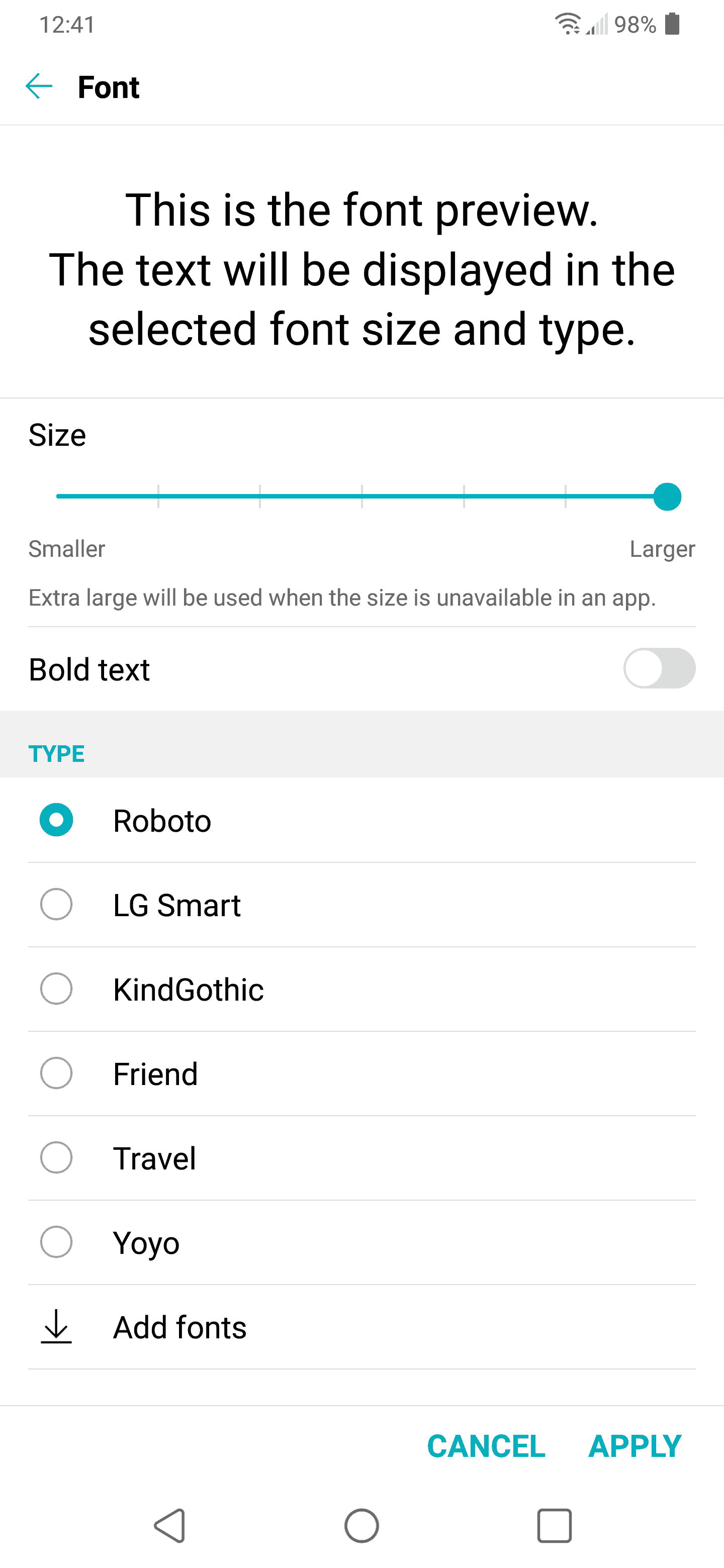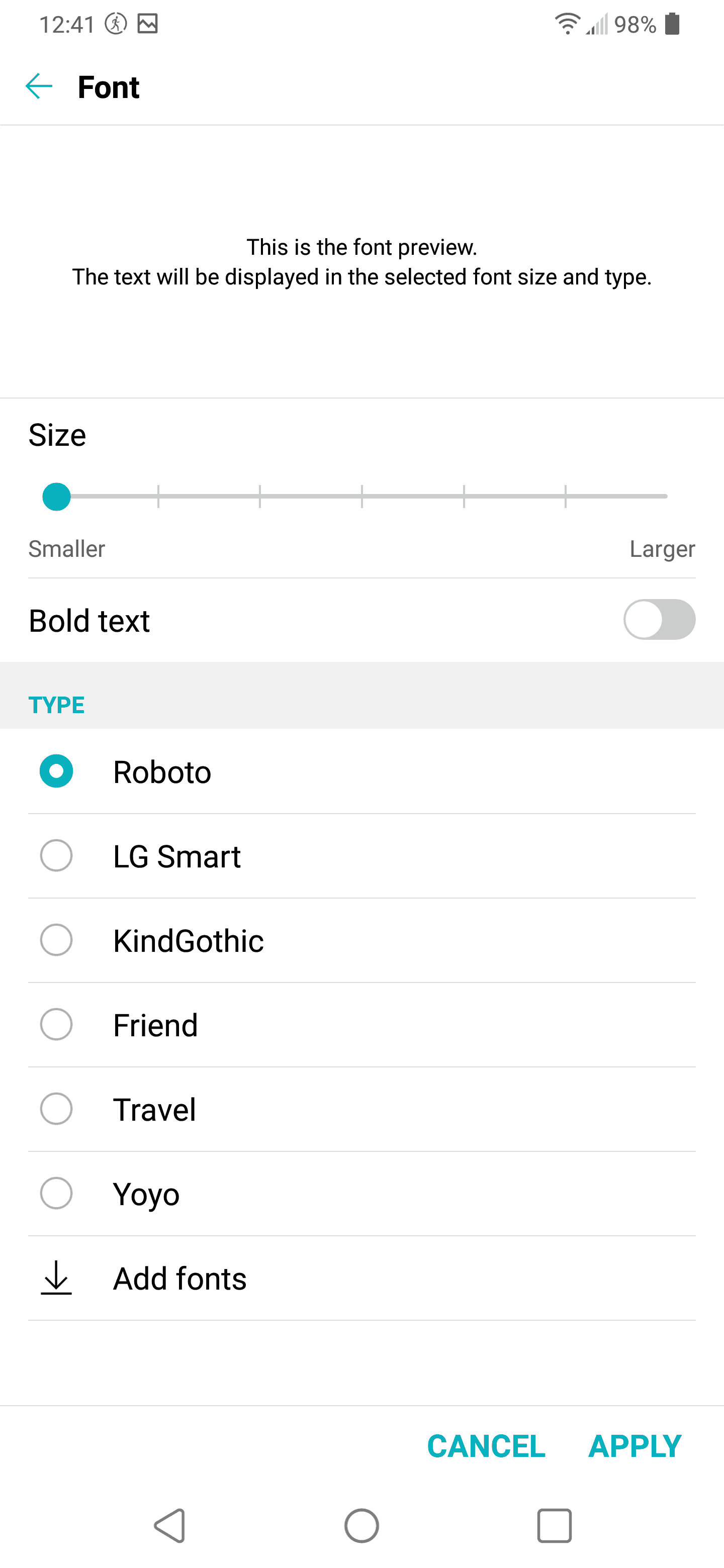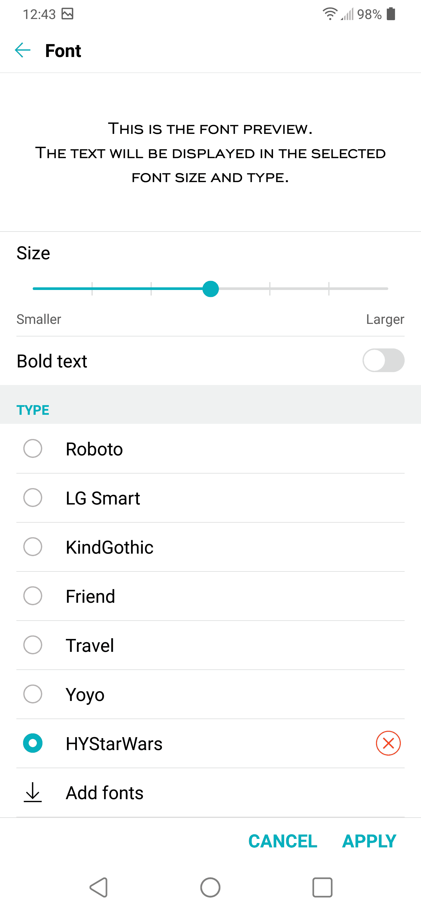 6. You can tap add fonts to be taken to the font section of LG Smartworld (LG’s app store on the phone).
