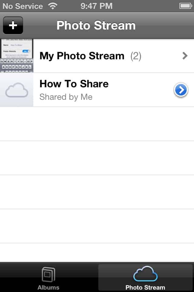 1. To create a Shared Photo Stream, launch the Photos app on your iOS device, and select the Photo Stream option at the bottom of the screen. In the upper-left corner is a + sign; tap on it.
