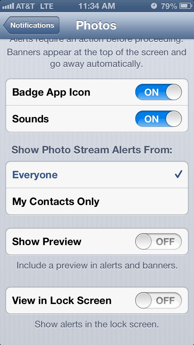 Now you will have the option to show Photo Stream notifications from Everyone or just your Contacts only. You will also be able to include a preview of notification in your alerts and banners and have the option of showing the notification in your lock screen.