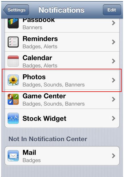 Once you have accepted an invitation to a shared Photo Stream Album you can control the notifications you receive through your Settings option. Tap on the Settings Icon and tap on the Notifications option.