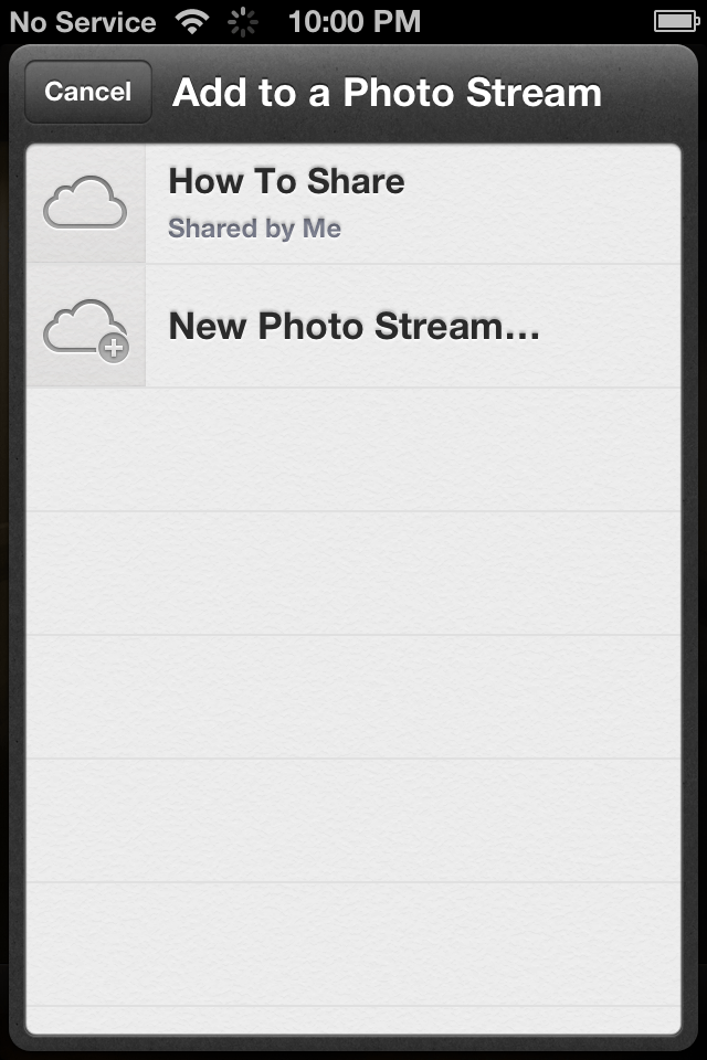 4. Now it’s time to add photos to your shared Photo Stream album. You can send photos to the shared album by viewing photos in the Photo app and tapping on the share button. Select Photo Stream from the list of options. Top right hand icon titled “Photo Stream”Additional Tips & Tricks