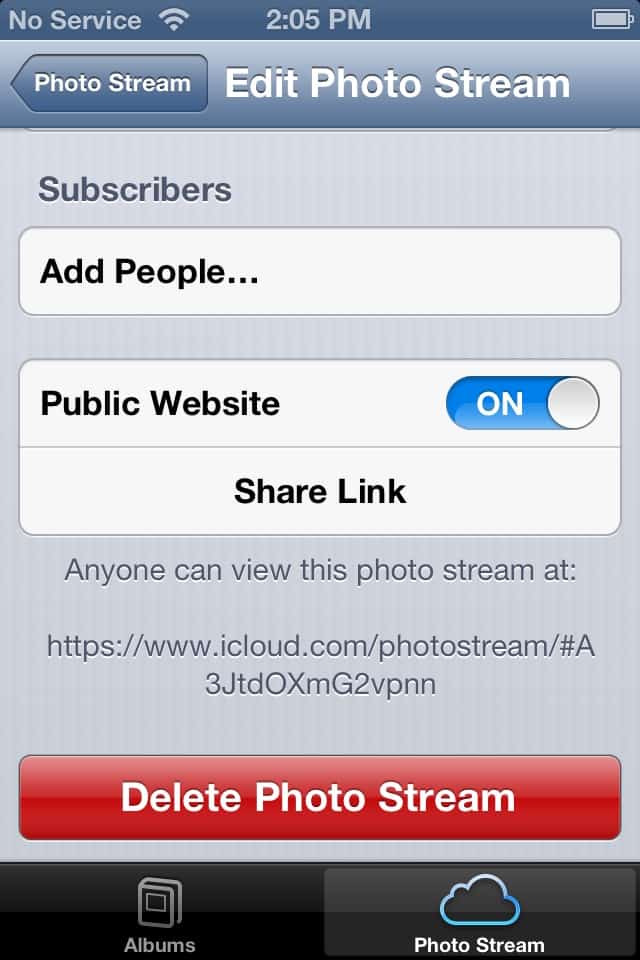 Go to the photo streams on your device, look to the right of each one and you will see a little blue circle with a white arrow in it. This icon will give you access to more settings. Tap on the icon and here you will find the red “Delete Photo Stream” button at the bottom of the screen.