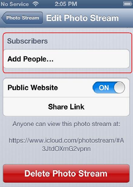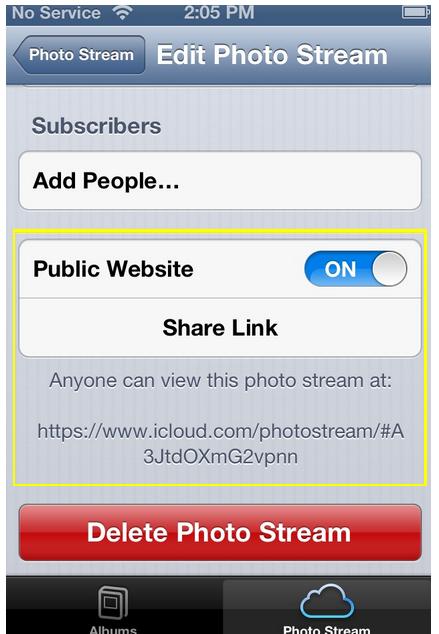 Once you have created a new shared photo stream and made it public you can share the URL address with anyone. To access the URL address go to the photo streams on your device, look to the right of each one and you will see a little blue circle with a white arrow