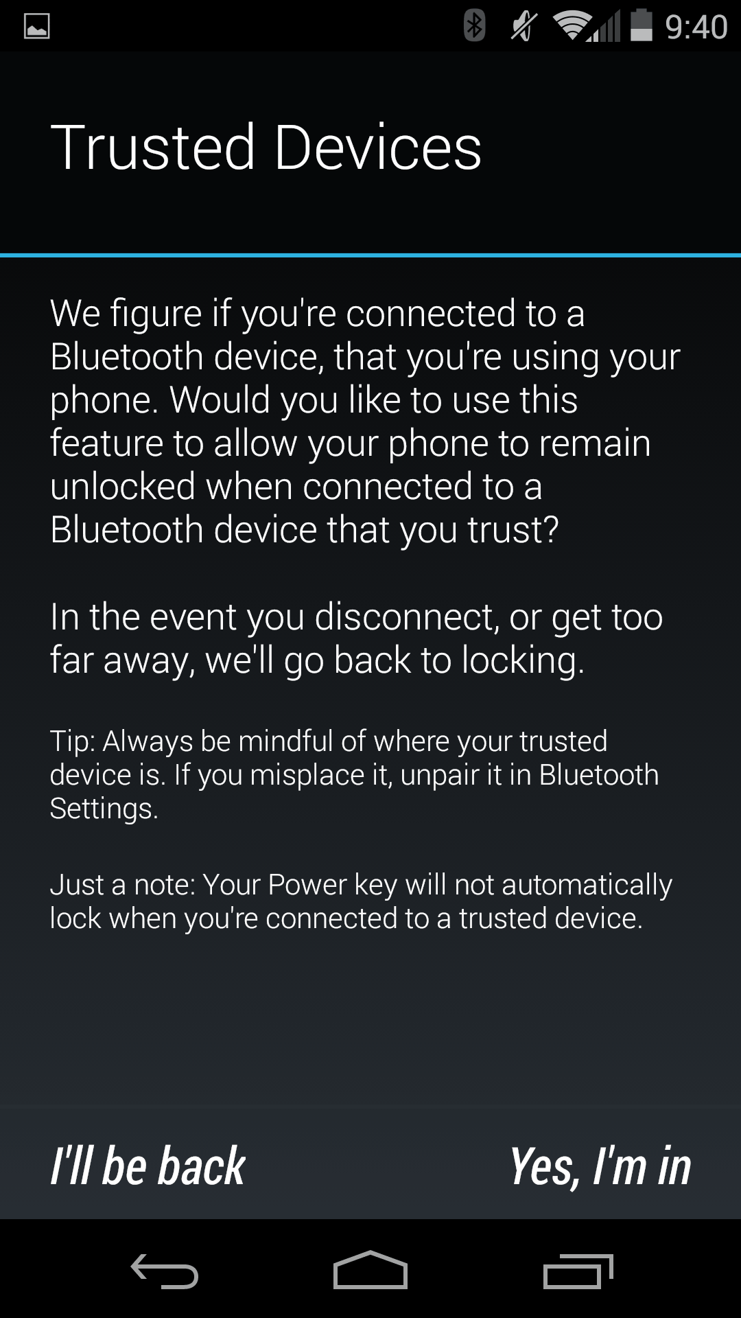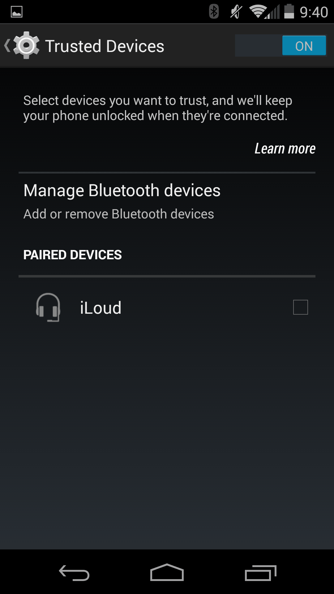 Note: The feature only works if you’ve got an unlock method that isn’t “none” or “slide”. If you’re using one of those methods (or non methods as the case may be), your device security is already low, and trusted devices mean very little, there. If you use a more secure method occasionally, we suggest slipping into that profile now so you can set up trusted devices.