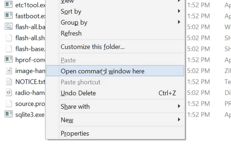 4. While holding shift on your keyboard, right-click any blank space in that platform-tools folder and select Open Command Window Here.