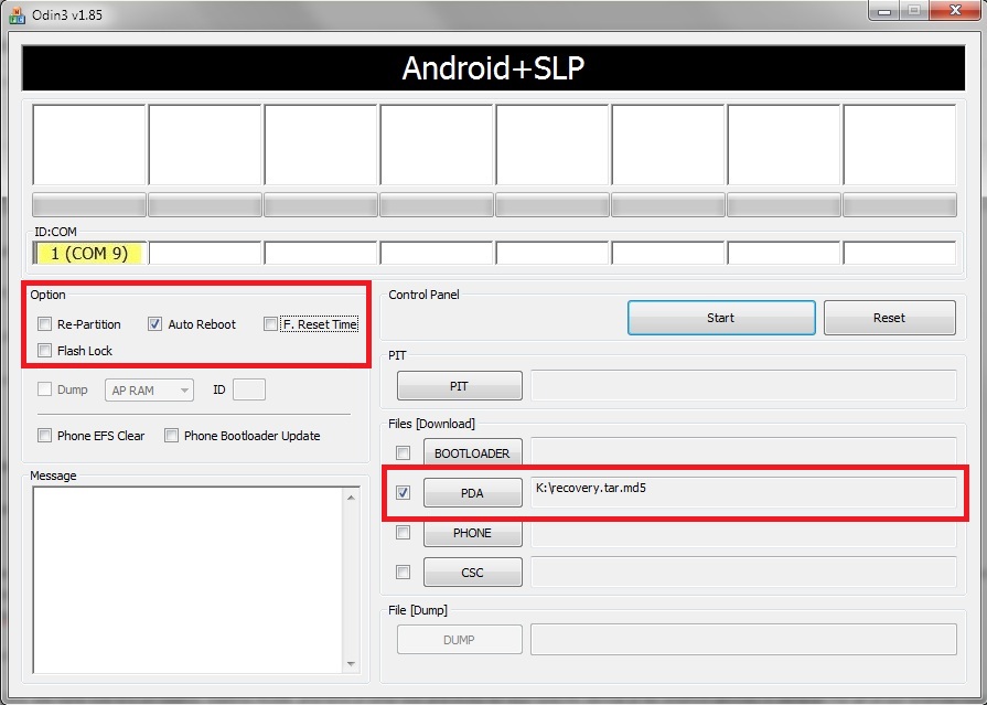 8.  Make sure your Odin screen looks like below (click on the picture to enlarge) and then press Start.