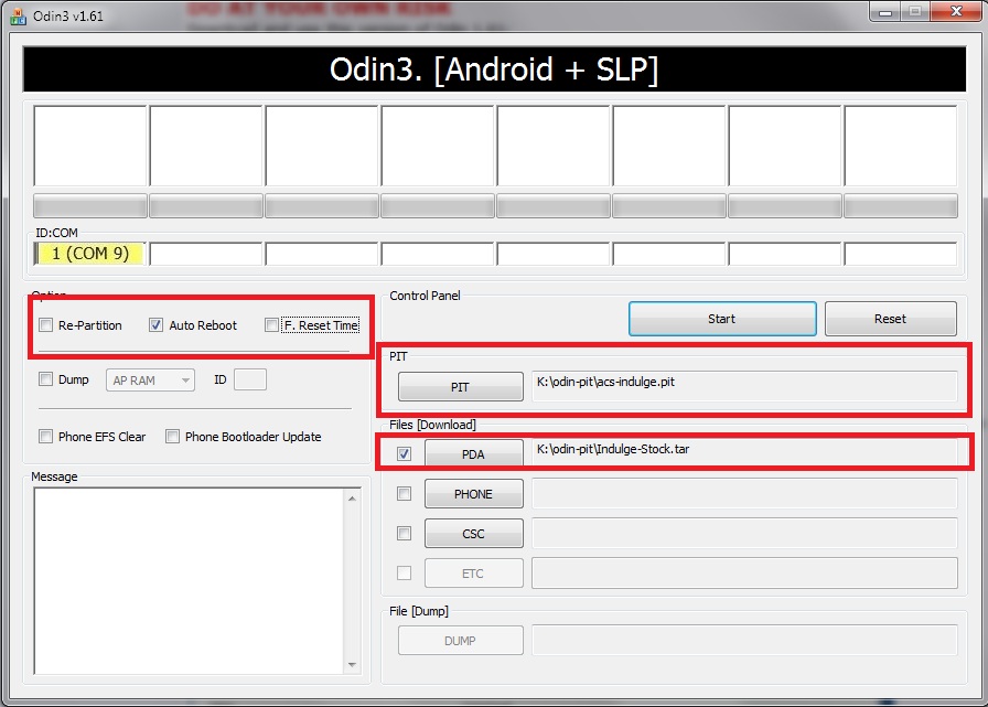 7.  This is very important.  Make sure that the Re-Partition tickbox is unchecked.  You will definitely brick your device if you do not uncheck it!!  Only the Auto Reboot tickbox must be checked.  Use the image below to guide you.