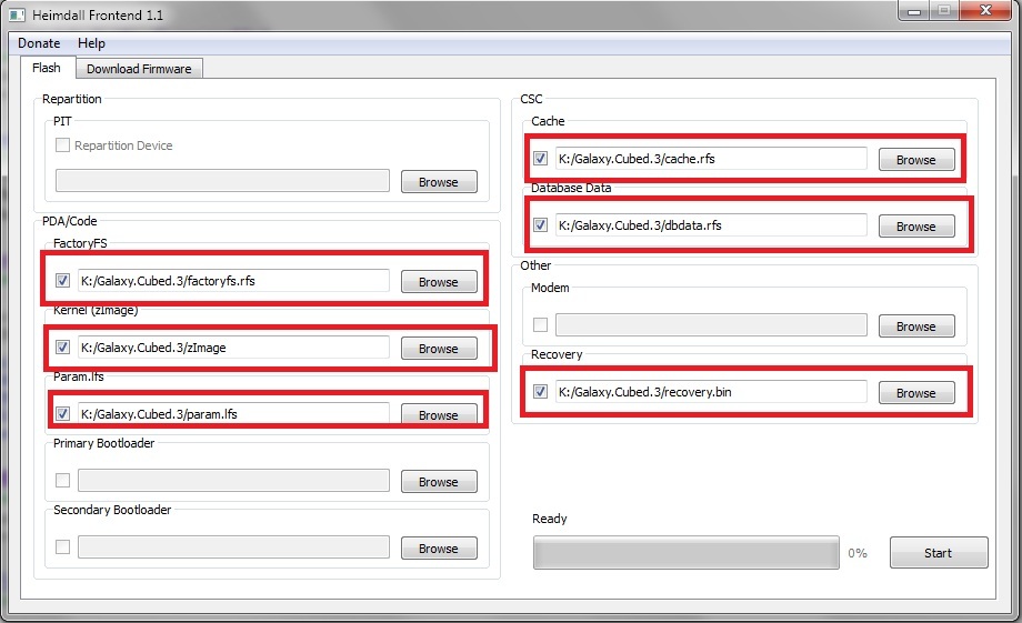 3. Now, load the files that you extracted from Galaxy.Cubed.3.zip to Heimdall exactly as you see in the screenshot below (click on the picture to enlarge):