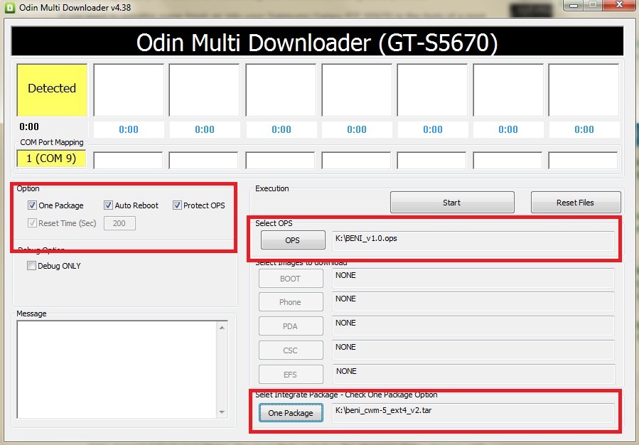 6. Click on the OPS button under the Select OPS section and chose BENI_v1.0.ops from the files you downloaded. Tick the One Package option under the Options section; this should enable the One Package button. Click on the One Package button and select beni_cwm-5_ext4_v2.tar from the files you downloaded.