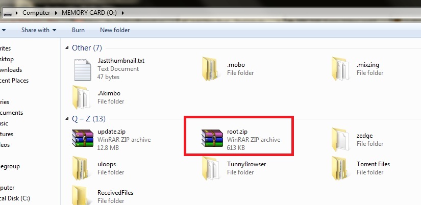 1. Copy the root.zip file you downloaded above to the topmost folder of the Tab’s external storage. This means that it should not be copied to any folders as you see below: