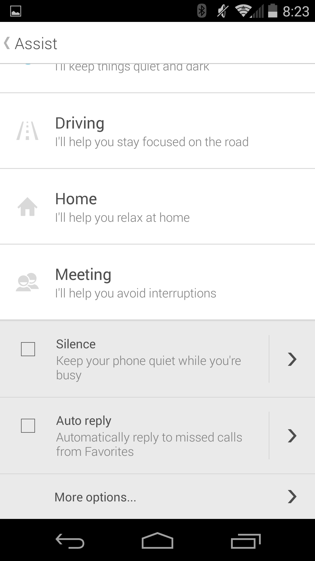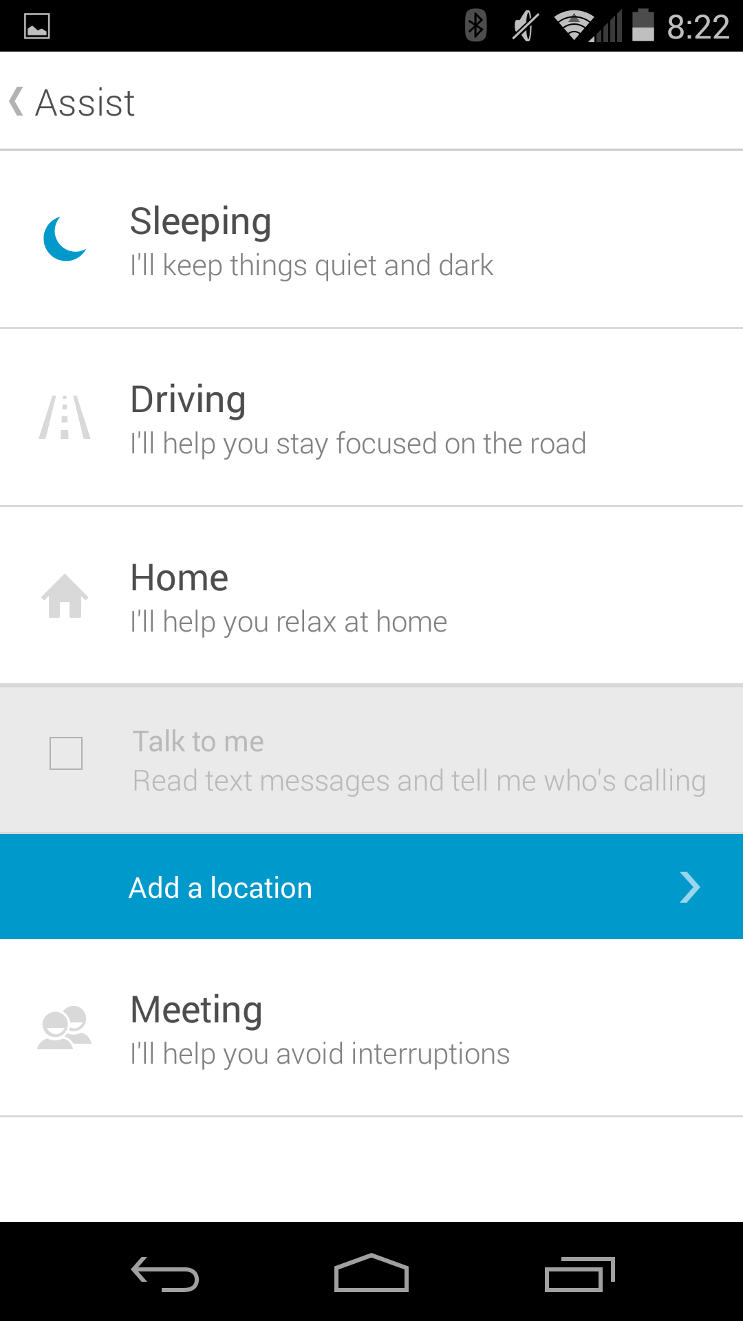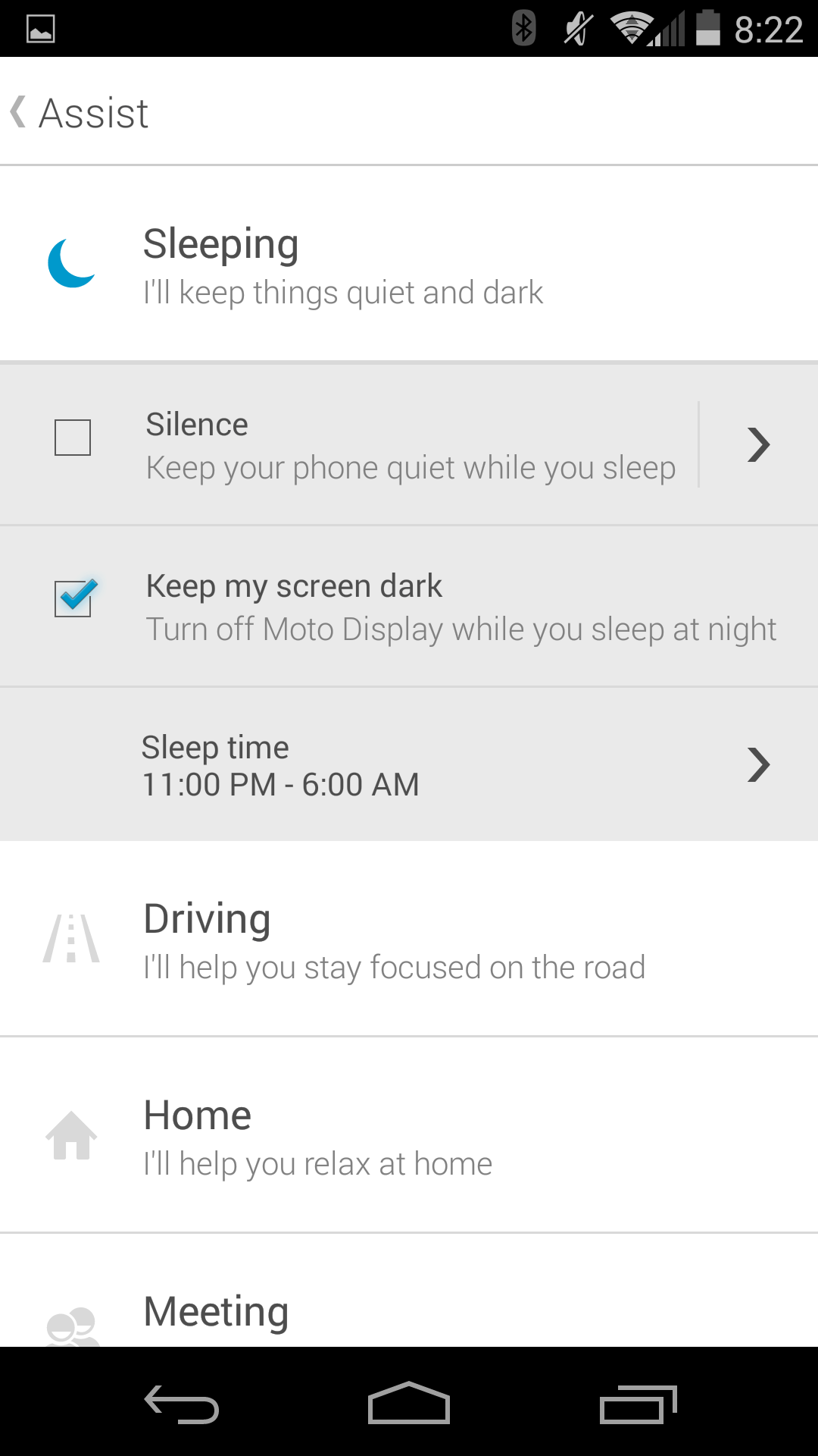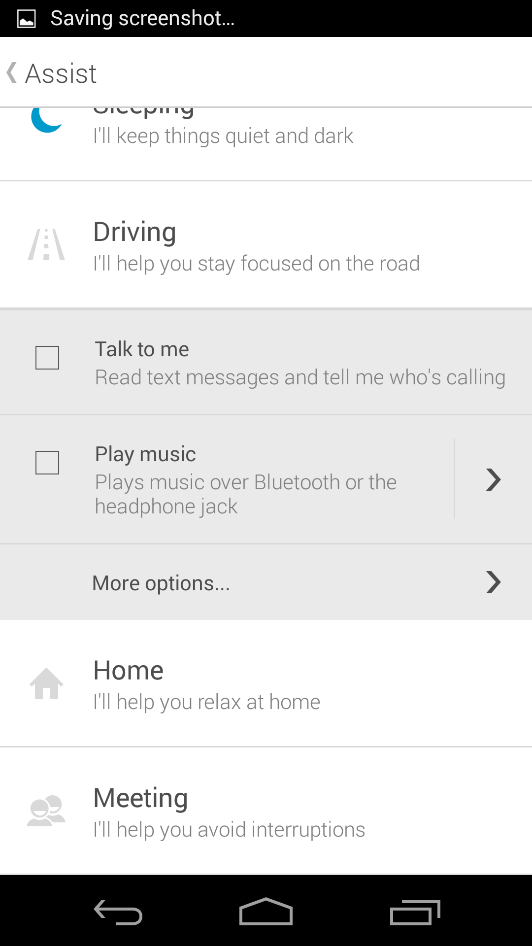 From here, you’re met with four options: Sleeping, Driving, Home, and Meeting. Sleeping lets you better manage notifications and the active screen while you’re asleep. Driving will read your messages to you, or launch your favorite music app while you drive.