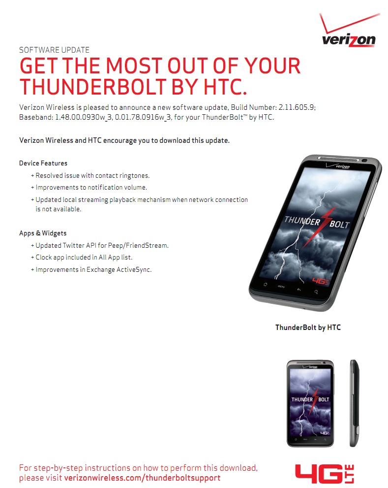 For anyone still rocking the HTC Thunderbolt, this is your lucky day as a much needed update is finally available to squash some of those annoying bugs you’ve been dealing with. Update 2.11.605.9 brings Thunderbolt users improvements on the contact ringtone, notification volume, and local streaming playback. Users will also notice enhancements made to Exchange ActiveSync. Additionally, the clock app now appears in the app list, and the Twitter for Peep app has been revamped.