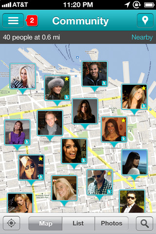 • Community: Provides a map view of friends near your location, a list view of friends, and a grid of photos