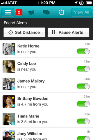 • You can then set notifications to alert you when your friends are  anywhere between a 1/mile away to 10 miles away from your current location. If you want you can select certain friends that you do not want to receive notifications about and you can also pause notifications all together.