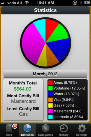 The app provides four main bill management functions: bills, statistics, categories, and history. You can easily add individual bills details including the amount of the bill, category, due date with a reminder, repeating bill information, and any custom notes. Statistics allow you to visualize exactly where your money is being spent in a clean and colorful interface Categories help you organize bills, and a customizable history allows you to see bills within a select time frame. For anyone needing help managing past payments, Bills has a payment tracker that allows you to enter the date and amount paid for an individual bill. This data is then stored and shows up as a payment history. Bills for iOS is equipped with iCloud support, which enables you to sync your data and backup anything you store within the app across all your iOS devices.