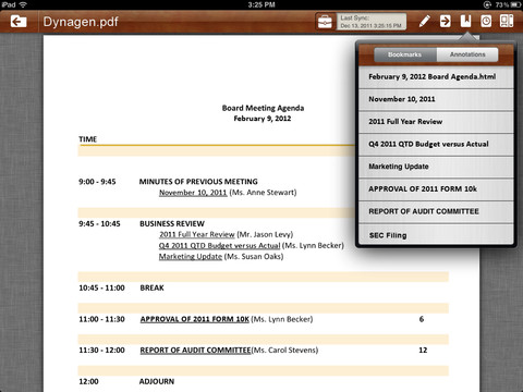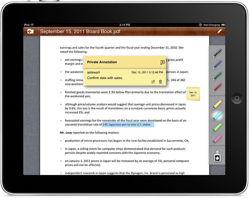 Once the app has been set up with your company documents the user can access centralized location for the current meeting in progress. At the top you will see photos of all the attendees participating in the meeting and with a tap on their picture you can initiate a dialogue with that board member. Below the attendee’s photos you will have easy access to all of your committee books, or otherwise known as boardbooks. To access a specific book simply tap on the book image that you want and you can access all of the documents that are part of that binder. You can scroll up and down each document and click on links to view more specific related material. True to iPad fashion you can make individual text notations or highlight sections of each document that will remain private. Additional features of the BoardVantage app can be seen below: