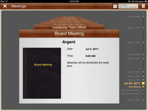 • Timeline allows directors to instantly access prior, current, and future meetings. To view a specific meeting just tap on the date found on the timeline and the meeting will appear immediately for your review.