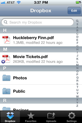 After you download the app you will either have to log in using your existing Dropbox account or you can quickly create an account if you are new to Dropbox. I find it easier to set up your Dropbox account on your home computer or laptop and then access the iOS app from your mobile device after you’ve set up your account. Once you open the app you will see an alphabetical list of all the files and folders you have stored within Dropbox. Native to iOS, just swipe up or down to browse through files or you can tap any letter on the right hand side to jump to a file beginning with that letter. This works in the same fashion that you would browse your iOS contacts from your address book.