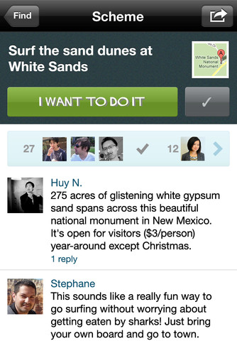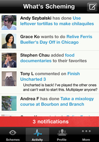 The app has three additional tabs which include find “find stuff to do”, “your schemes”, and “accomplice”s. The “find stuff to do” tab allows you to either search for schemes to do at your house or in your neighborhood. This is fun for the times that you are truly bored and need inspiration on what to do next. Tapping on “Staying Home” pulls up schemes like “reading Steve Jobs Biography” or “Trying to grind my own coffee”. Tapping on “Your Neighborhood” you will see schemes like “Eat at Macaroni Grill” or “Visit the Boca Museum of Art”.