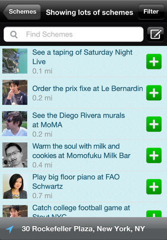 You will need a Google+ account to log into Schemer, which means you won’t have to start all over to find your friends. After signing in with your Google+ email address, Schemer automatically syncs with your Google+ circles to create an activity feed of what your accomplices have been scheming on. The app will then ask for your current location so you can view suggested schemes locally or search by schemes close to your location.