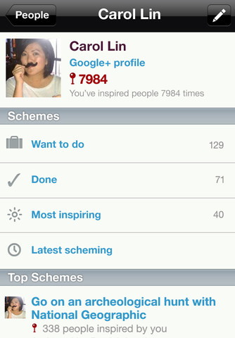 The home screen is easy to use and has a fresh clean look to it. Here you can add a scheme or get ideas from your friends or experts. You can also use the search field to look up schemes based on location. For example, while I was at Disney World I typed in “Disney” into the search field and thousands of schemes popped up instantly. Looking up schemes by keywords is a great way to see what other people have already done in the same area. If you want to add anything to your own list simply tap once or tap twice to mark it as a completed scheme.