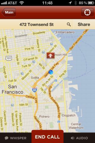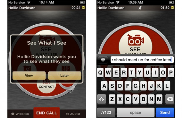 After you have downloaded the Sidecar app you can immediately start the service. Unlike FaceTime, Sidecar is not bound to one specific platform but both users will have to download the app. If you do try to contact someone through the app who doesn’t have Sidecar, they will be sent an SMS prompting them to download the app. To share either a photo or video while talking to someone, simply tap the photo or video icon and the app will put you on speaker while it sends the photo or displays the real-time video to the person you are on the phone with. If you want to meet up with someone, you can share your location with them as you both look at an interactive map. Additionally, if talking is difficult at the moment you can “send a whisper” which displays as a text message to the other person while on the phone call.