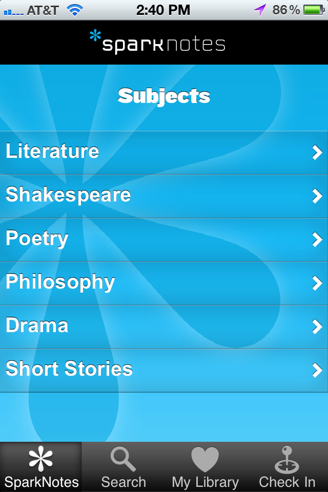 If you’re currently enrolled in school or studying literature, then you’ve probably already heard of Spark Notes. For anyone who is not familiar with Spark Notes, they provide popular study guides and forums for various academic subjects. In other words, if you decided to go out drinking instead of studying the night before a big test and you need to know the who, what, why, when, and where of a story, Spark Notes can usually pull you through a tough spot. What you may not know is that Spark Notes has a convenient iOS app perfect to take with you on the go. With the Spark Notes app you can brush up on story summaries, plot overviews, character lists, themes, motifs, and symbols all from your iPhone.