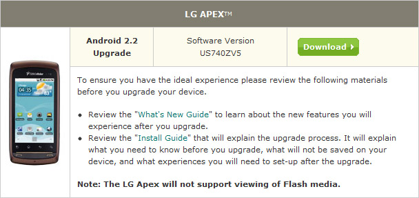 Given its current position as a low/mid-segment Android device, we are assuming that this will be the last update ever for the LG Apex – on US Cellular and elsewhere too. Apex users yearning for something running Android 2.3 or better might want to take a look at other options on the carrier’s shelves. Still, Froyo is a big step-up compared to the fast-disappearing Eclair and brings a lot of previously unavailable features to the device.