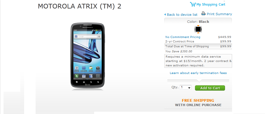 Announced last week along with the Samsung Captivate Glide and DoubleTime, the Motorola Atrix 2 is now available from AT&T on its online store. The current iteration of the Atrix brings the device’s specs up to speed and on par with other high-end smartphones that are currently available now.