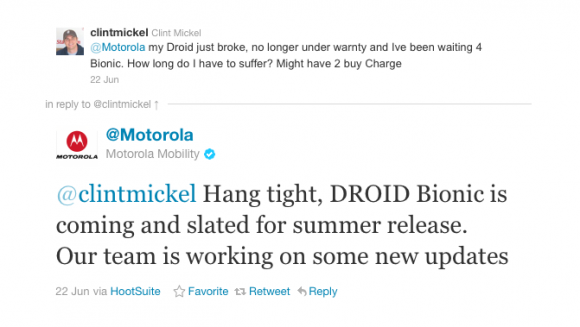 “Hang tight, DROID Bionic is coming and slated for summer release. Our team is working on some new updates.”
