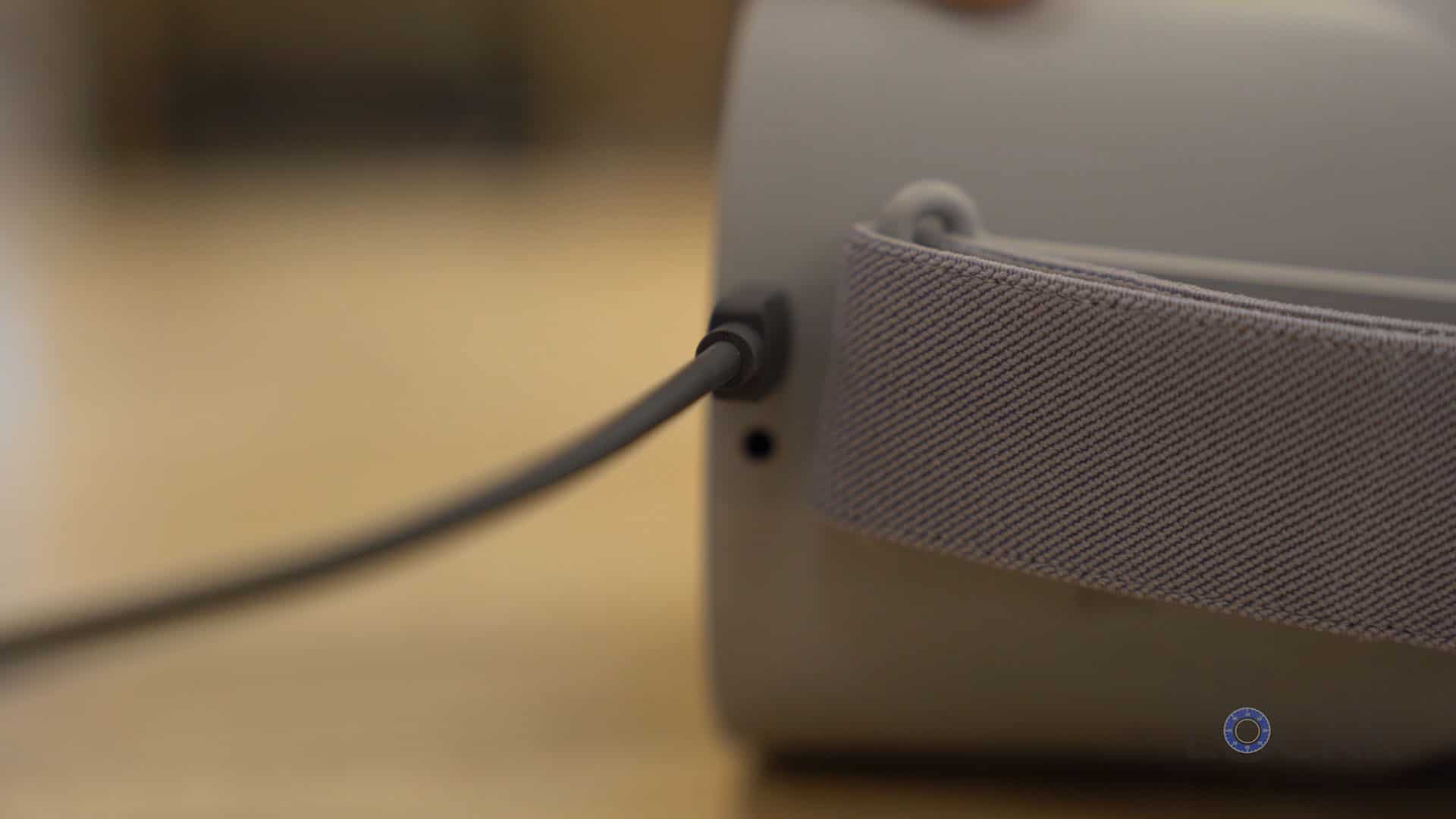 On either side of the headset, we have two spatial audio speakers that aim to give you a surround sound-like experience. But, if you want you can also connect your own headphones if you want via the 3.5mm headphone jack on the left side. Also on this side, we have the MicroUSB port that you can use to charge the device with the included charger or if you plug it in to the computer and use the controls in the headset to give your computer permission you can access the storage on it if needed (we’ll get to why you might want to in a sec).