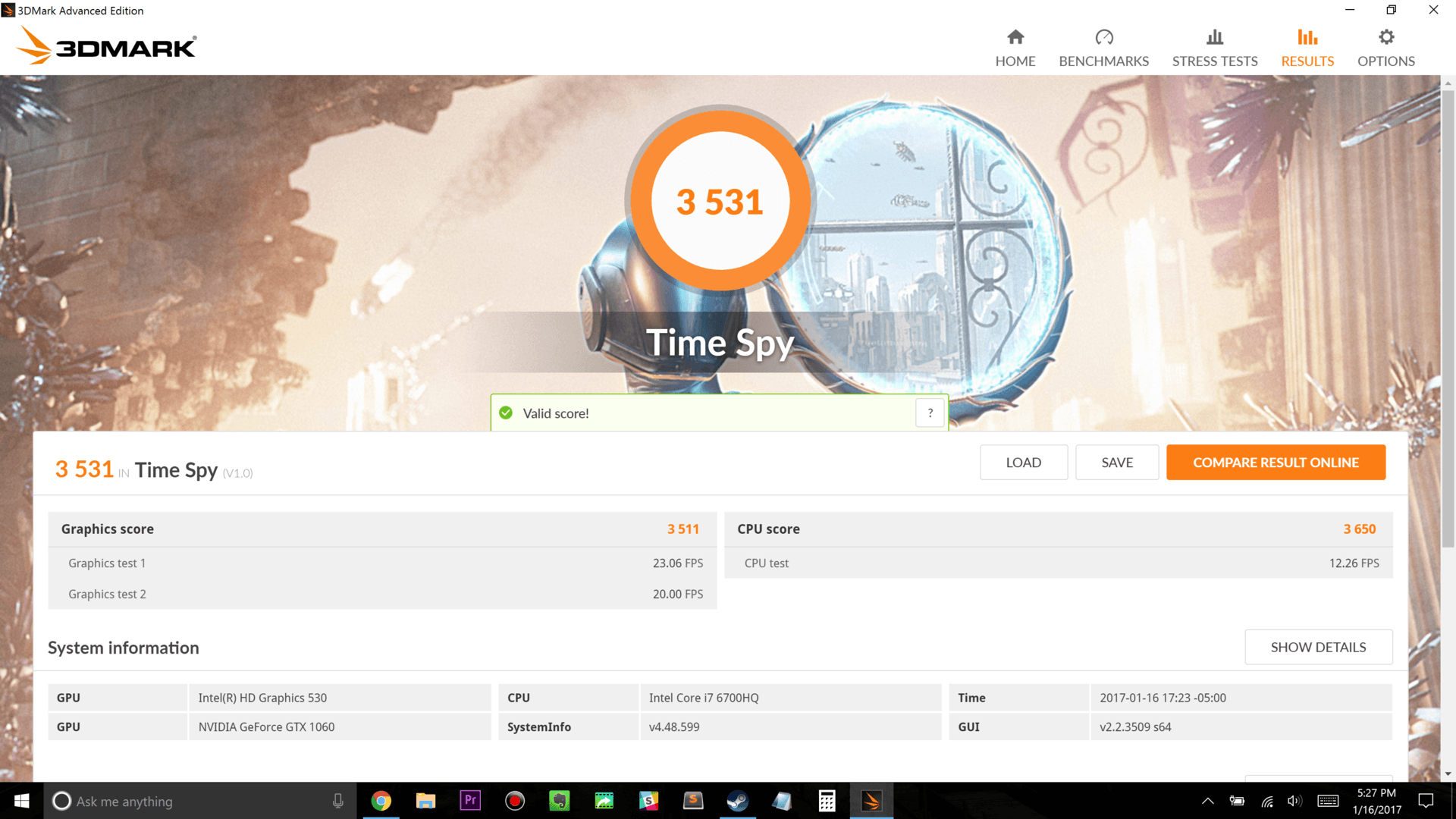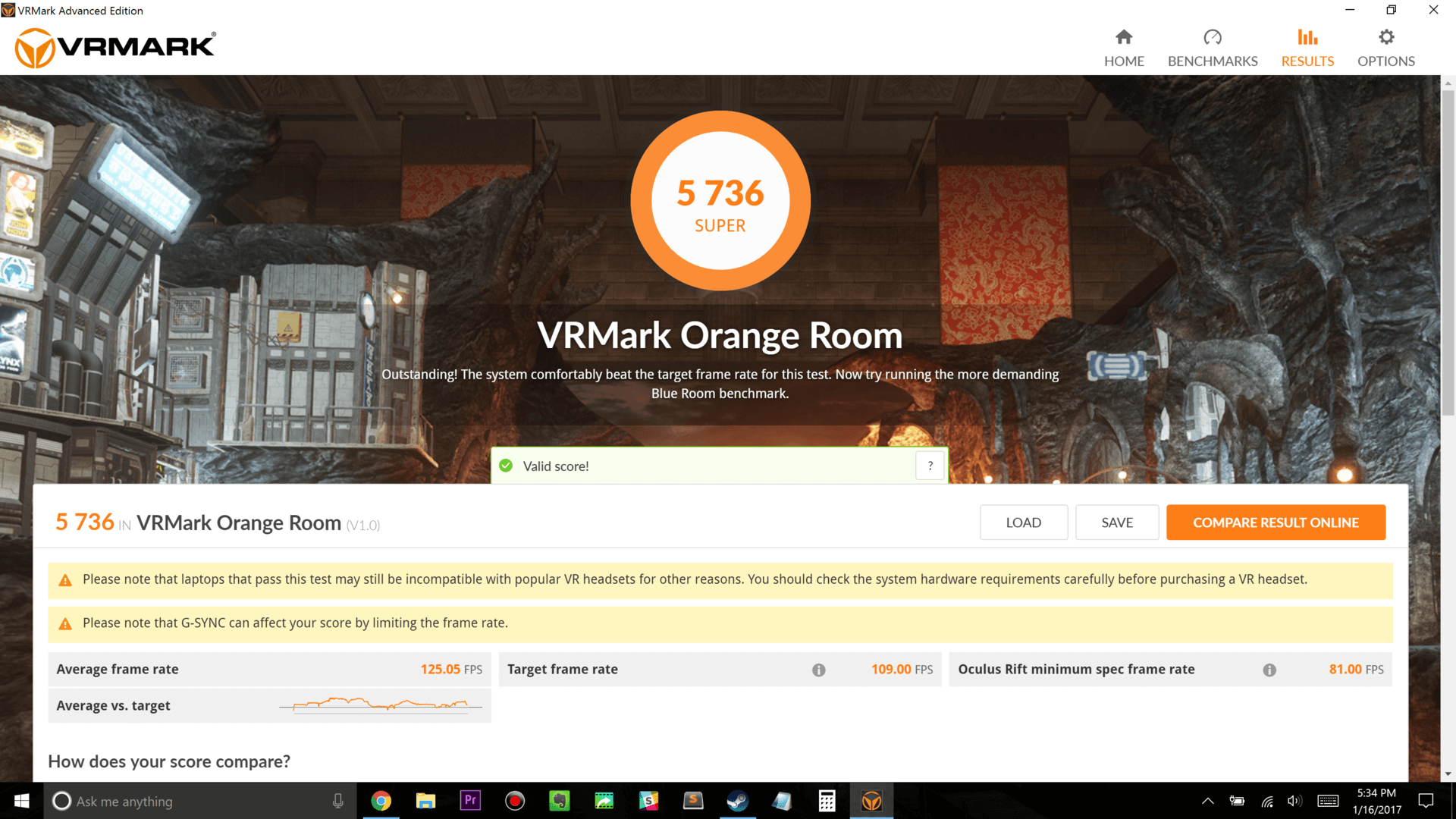 Using the 3DMark Time Spy test, the Blade managed to get a score of 3531 on all the default settings (2.5K, running internally on the laptop) and managed a score of 5736 on th VRMark test meaning it’ll handle anything a Vive or Rift can throw at it basically. Oh yeah, it runs VR just fine which I have now used to impose VR on friends and family more portably than bringing my clunky desktop around with me. Bonus feature for sure.