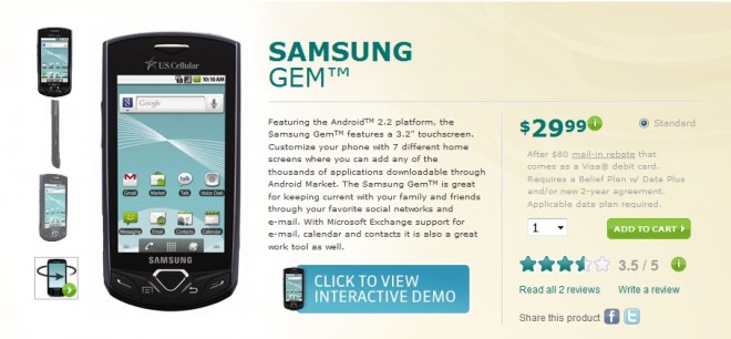 If it’s a wallet-friendly droid phone you are looking for on US Cellular, the Samsung Gem should fit the bill perfectly. After being adopted by Alltel, the Gem is now available on US Cellular, going for a mere $29.99 with a new contract. The feature set befits the light price tag and includes: