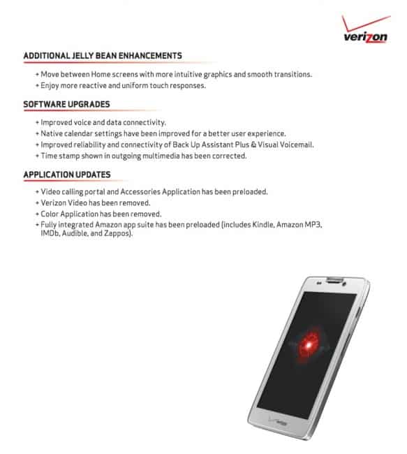 The 276 MB update will offer up all the sweetness of Jelly Bean including: Google Now, improved notifications, an enhanced keyboard, better Voice Search, and Project Butter. As an added bonus, Verizon and Motorola worked together to improve voice and data connectivity, the user experience in the calendar, and Back Up Assistant.