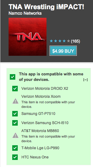 The feature is already available when accessing the Market from an Android device, but this would definitely help those accustomed installing apps from the desktop browser.  The Market now determines whether an app is compatible with any of your devices (assuming you have more than one Android device), before you start installing it from the webstore, saving you a precious few steps that would eventually lead to rejection if you have an incompatible device.  You can find the collapsible list detailing your devices right below the big blue “Install/Buy” button, so be sure to scan it before you install.