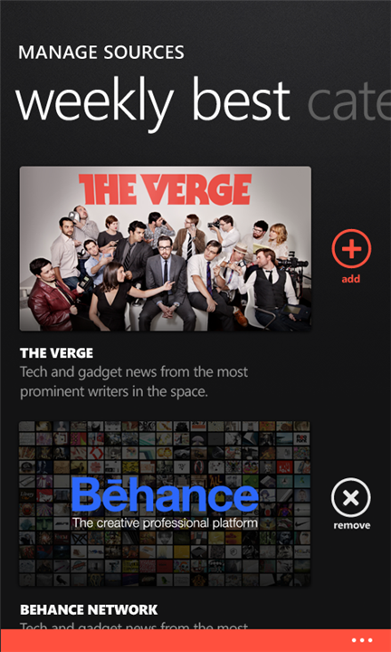 - Select “Find News Sources” to browse news sites and blogs by weekly best, category, or search for specific outlets (I obviously added “Serious Eater” and “Geeks.Have.Landed”)